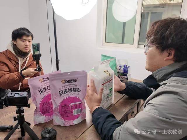 同在福财小院学习的王凯伦同学来自视觉传达专业,负责农产品直播运营。从早上九点到下午三点半,他每做一小时主播,就到后台做一小时助播,与同学们一同推广松江大米、云南苹果及各类小零食。王凯伦擅长调动直播间气氛,通过互动引发观众兴趣。他表示,自己的专业能为农产品包装和项目形象设计赋能,他计划继续深耕设计或摄影领域,将乡村实践积累的经验融入专业发展之中。