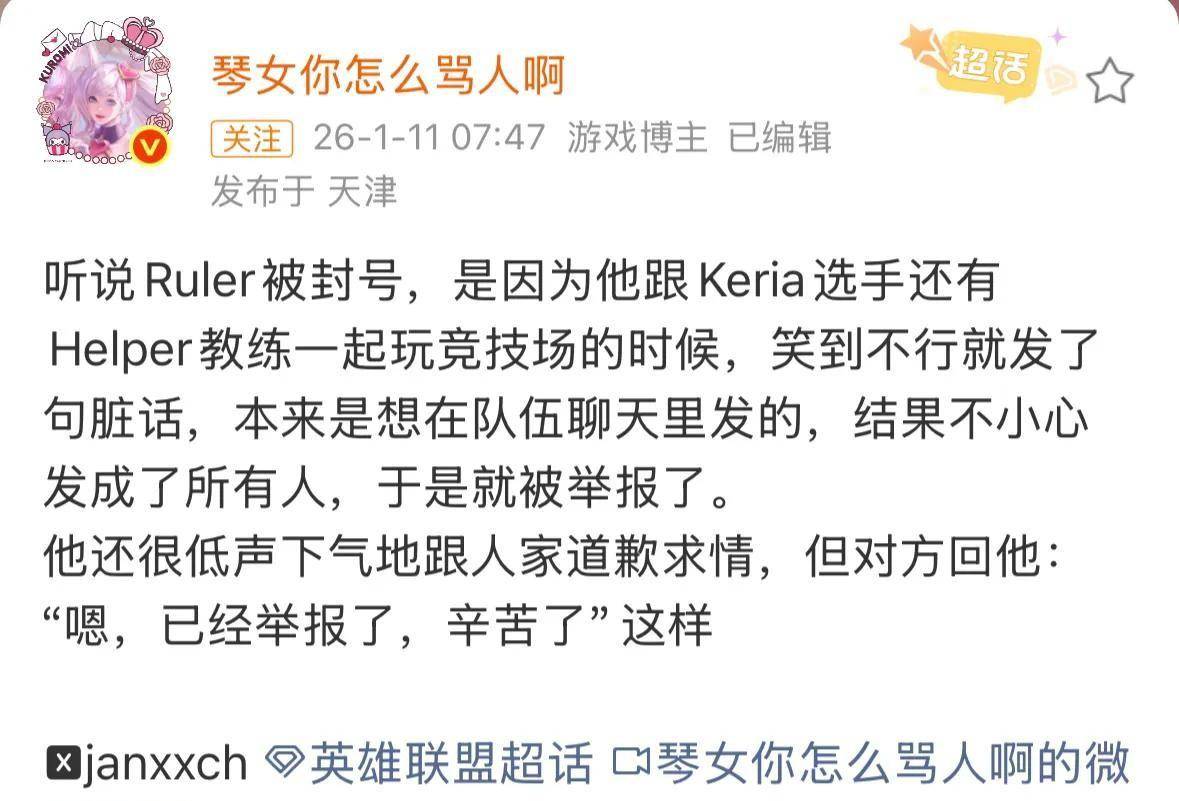 2026-01-16斗鱼,斗鱼直播,斗鱼APP,游戏直播,电竞直播,手游直播,lol直播,英雄联盟直播,dnf直播,cf直播,绝地求生直播,王者荣耀直播,二次元直播,英雄联盟,绝地求生,和平精英,魔兽世界,三角洲事情是这样的,Ruler是GEN战队那个明星AD,在直播中和T1的辅助Keria他们玩斗魂竞技场。玩嗨了,笑到不行,随口骂了句脏话。本来是想发在队伍聊天里的,结果手一滑,发到了所有人频道。
