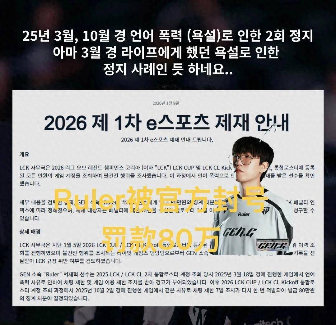 就这么个事。LCK官方处理得更干脆账号封禁七天,罚款80万韩元,折合人民币一万三左右。公告上还特意加了一句,“同样问题再次出现”。