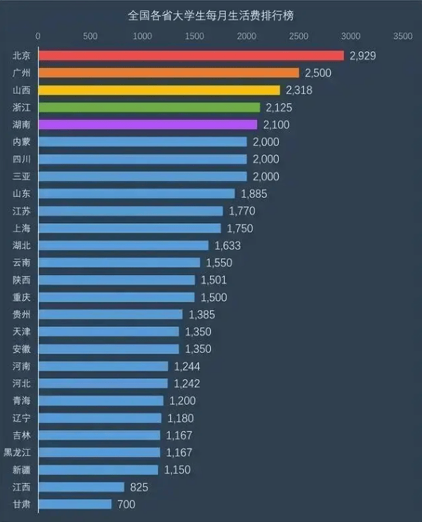 根据2024年最新出炉的《当代大学生消费报告》显示,北京、广州、山西、浙江等地,大学生每月生活费平均水平超过2000元,而2024年城镇居民人均月收入约4,515元(一线元。