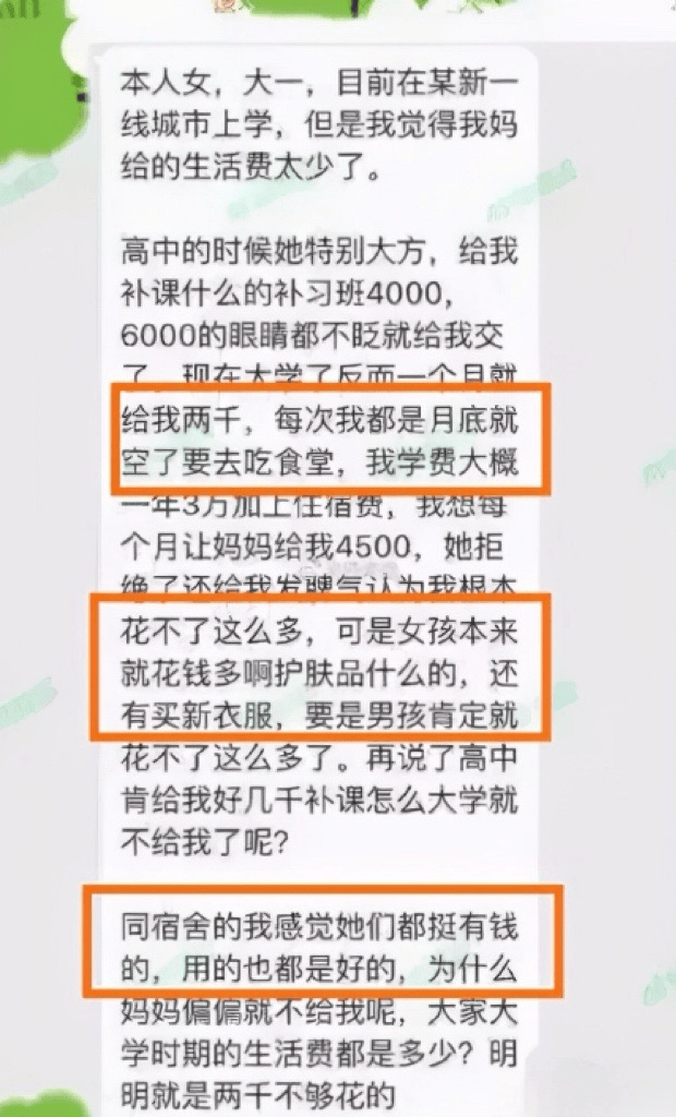 小红书上“,总有人晒出精致餐食、潮牌穿搭,把追星、聚会当成“刚需”,把钱和爱画了等号,认为父母不给钱就是不爱自己。