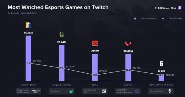 至于电竞赛事对游戏热度的贡献更是无需多言,育碧会在赛事期间公布彩六未来更新计划,充分调动玩家热情。所以每逢大赛期间游戏的关注度和日活都会上涨到全年最高值,像SI 2025期间,彩六就成功跻身Twitch直播平台热门游戏前五。