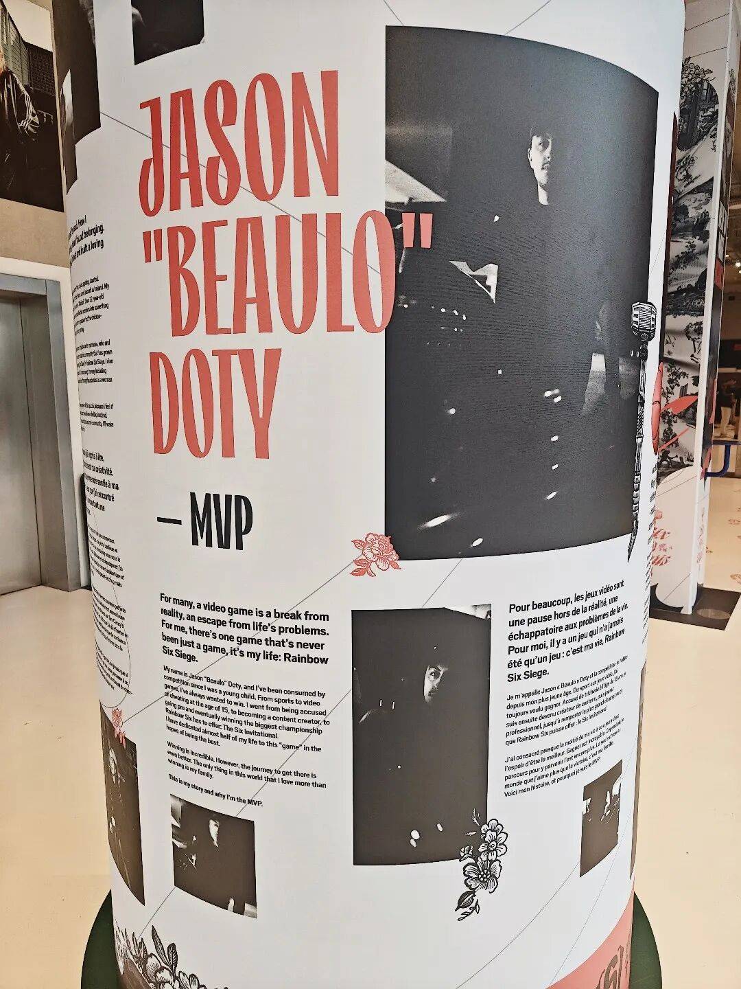 在舞台上拼搏的电竞战队和选手,自然属于光辉历史的一部分。顺着体育馆入口走向看台,在走廊的柱子和牌子上,印有英法双语的选手故事。天花板上也挂着一系列海报,列在上头的名讳属于彩六电竞史上响当当的传奇:Pengu,Fabian,Beaulo,Shaiiko,Canadian……