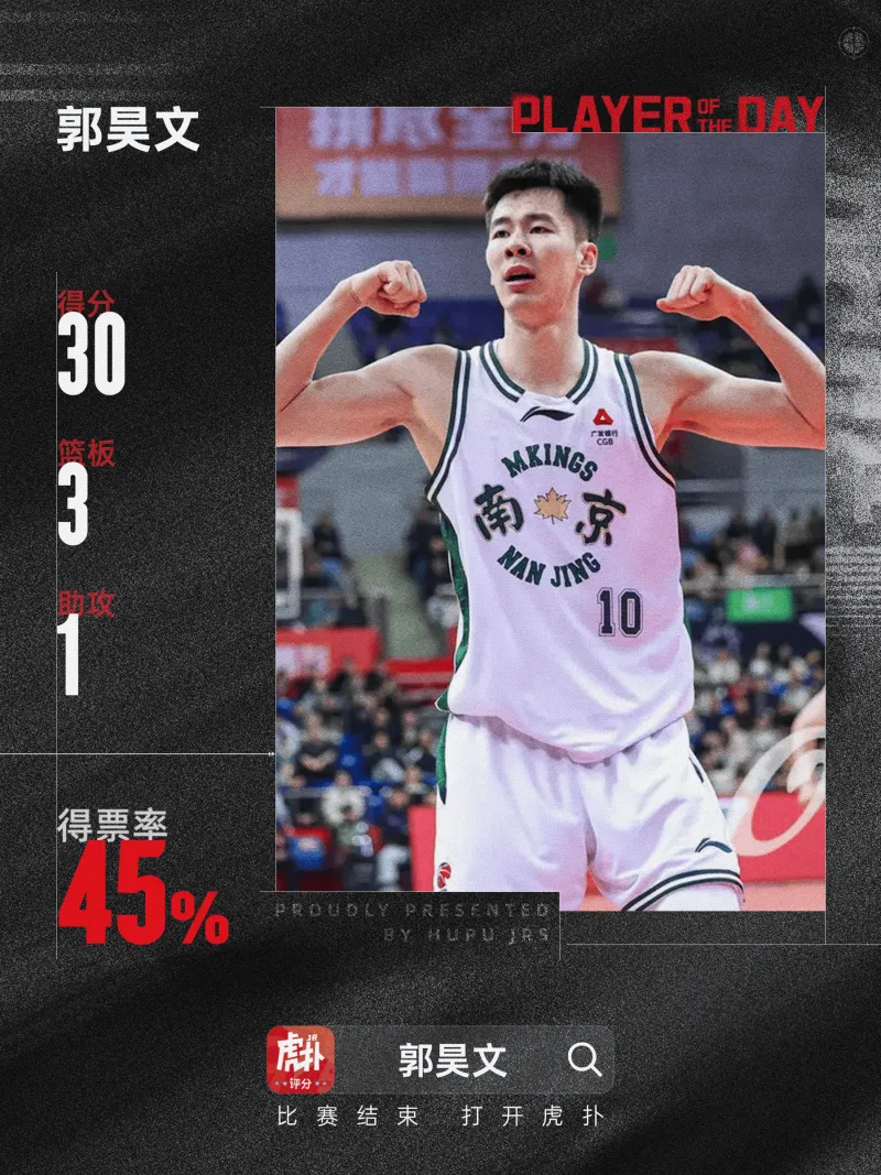 本场比赛,南京球员郭昊文出战35分钟,投篮17中7、三分6中2得到30分3篮板1助攻1抢断。