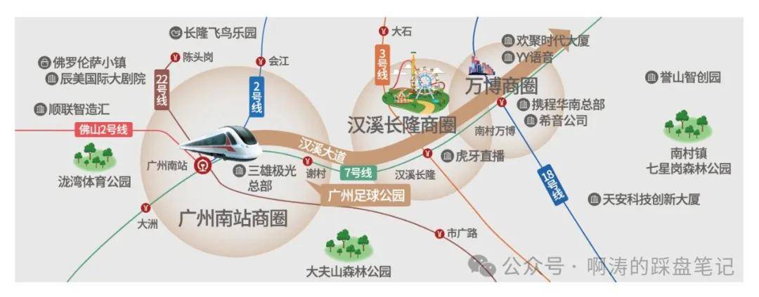 汉溪大道(正在建设中)将广州南站、长隆、万博等核心板块串联起来,聚焦万亿级产业集群,汇集了电商龙头希音、YY 语音、虎牙直播、小鹏汽车、三雄极光等 1700 多家高新企业。