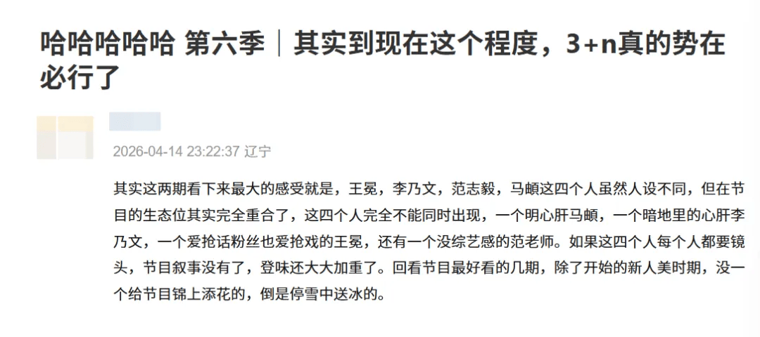 通过观众对《妻子》《5哈》两档节目的评价,不难看出嘉宾资源是对综N代的考验之一,将嘉宾的新鲜感和节目的功能性进行平衡,真是一项“众口难调”的任务。